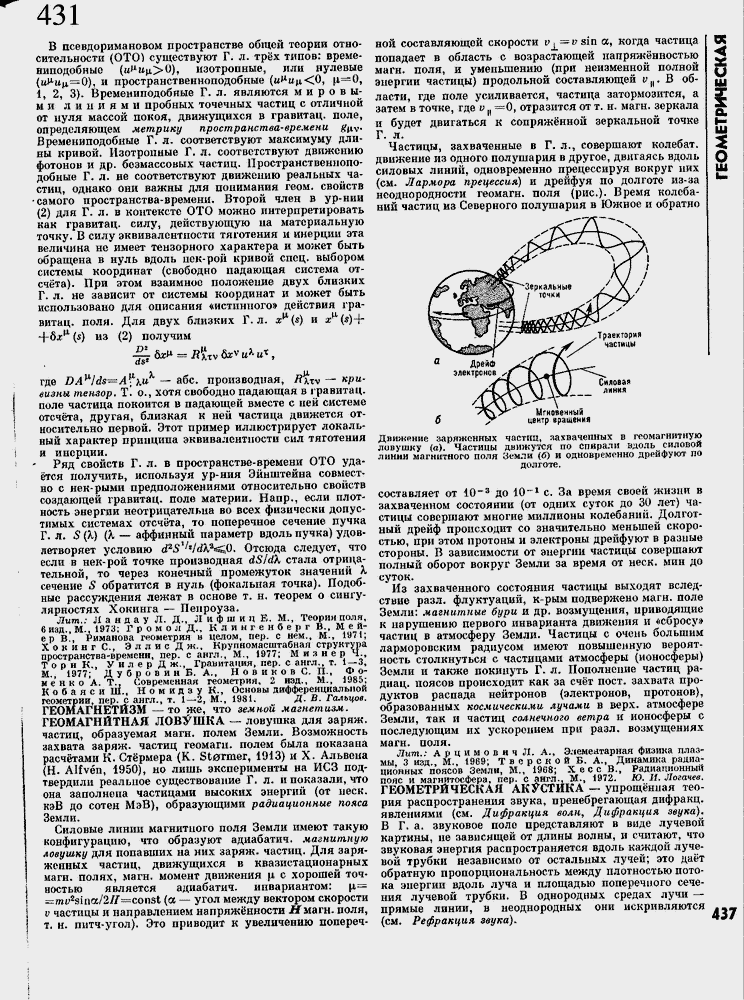 Лит.: Ландау Л- Д., Л к ф ш и ц Е. М., Теория поля, 6 изд., М., 1973; Г р о м о л Д., Кллнгенберг В., М е й-ер В., Риманова геометрия н целом, пер. с нем., м., 1971; X о к и н г С,, Э л л и с Д ж.. Крупномасштабная структура пространства -в реме ни, пер. с англ., М., 1977; Мизнер Ч-, Торн К., У и л е р Д ж., Гравитация, пер. с англ., т. 1 ≈ 3, М., 1977; Д у б р о в и н Б. А., Н о в и к о в С. П., Фоменко А. Т., Современная геометрия, 2 изд., М., 1985; К о б а я с и Ш., Н о м и д з у К., Основы дифференциальной геометрии, пер. с англ., т. 1 ≈ 2, М-, 1981. Д. В. Гольцов. ГЕОМАГНЕТИЗМ ≈ то же, что земной магнетизм. ГЕОМАГНИТНАЯ ЛОВУШКА ≈ ловушка для заряж. частиц, образуемая магн. полем Земли. Возможность захвата заряж. частиц геомаги, полем была показана расч╦тами К. Ст╦рмера (К. St0rmer, 1913) и X. Альвепа (Н. Alfven, 1950), но лишь эксперименты на ИСЗ подтвердили реальное существование Г. л, и показали, что она заполнена частицами высоких энергий (от иеск. кэВ до сотен МэВ), образующими радиационные пояса Земли.