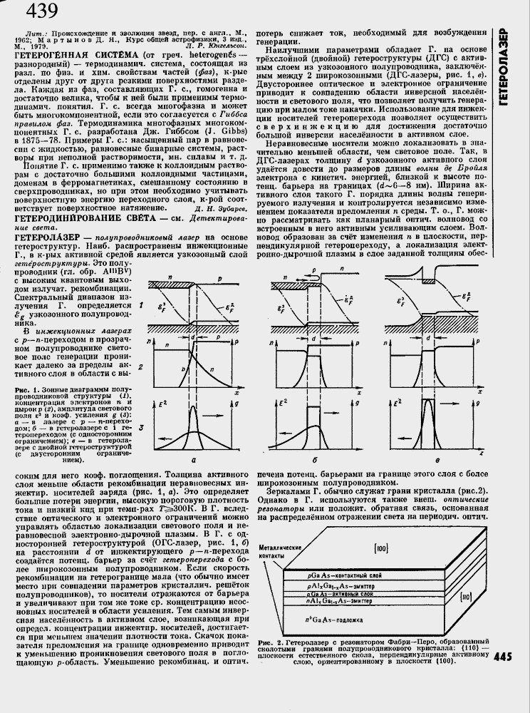 соким для него коэф. поглощения. Толщина активного слоя меньше области рекомбинации неравновесных ин-жектир, носителей заряда (рис. 1, а). Это определяет большие потери энергиит высокую пороговую плотность тока и низкий кпд при темп-pax Г^ЗООК. Б Г. вследствие оптического и электронного ограничений можно управлять областью локализации светового поля и не-равновесной электронно-дырочной плазмы, В Г. с односторонней гетероструктурой (ОГС-лазер, рис. 1, б) на расстоянии d от инжектирующего р≈«-перехода созда╦тся потенц. барьер за сч╦т гетероперехода с более широкозонным полупроводником. Если скорость рекомбинации на гетерогранице мала (что обычно имеет место при совпадении параметров кристаллич. реш╦ток полупроводников), то носители отражаются от барьера и увеличивают при том же токе ср. концентрацию неосновных носителей в области усиления. Тем самым инверсная насел╦нность в активном слое, возникающая при определ. концентрации инжектир. носителей, достигается при меньшем значении плотности тока. Скачок показателя преломления на границе одновременно приводит к уменьшению проникновения светового поля в поглощающую р-область. Уменьшение рекомбинац. и оптич.