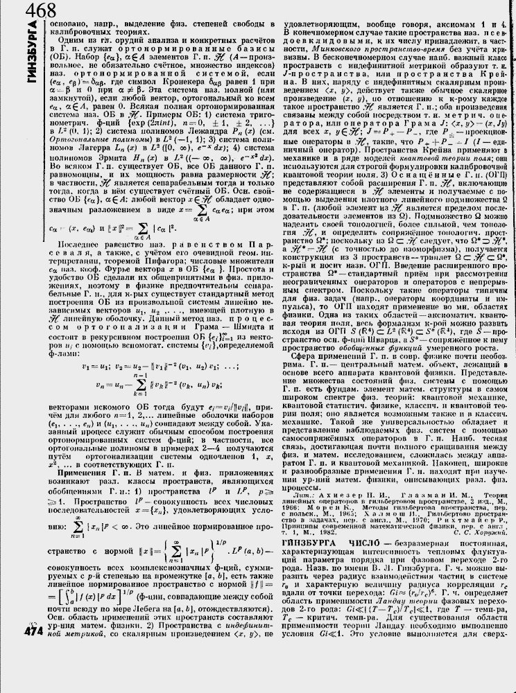 Последнее равенство паз. р а в с п с т в о и Пар-сева л я, а также, с уч╦том его очевидной геом. интерпретации, теоремой Пифагора; числовые множители Со, паз. к<юф. Фурье вектора х в ОБ [еа }. Простота и удобство ОБ сделали их общепринятыми в физ. приложениях, поэтому в физике предпочтительны сонара-белыные Г. н., для к-рых существует стандартный метод построения ОБ из произвольной системы линейно не-нависпмых векторов ы1, и% ,. . ., имеющей плотную в fff линейную оболочку. Данный метод паз. процессом о р т о г о п а л 11 з а ц и к Грама ≈ Шмидта и