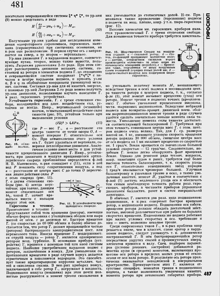 где Р ≈ вес Г., а ≈ расстояние его центра тяжести от точки опоры О, А ≈ момент инерции. Г. относительно оси Ох. При невыполнении этого условия ось Г. будет удаляться от вертикали, совершая петлеобразные движения. Аналогичное условие имеет место п для устойчивости прецессионного движения Г. Напр., устойчивость при движении в воздухе вращающегося артиллерийского снаряда приближ╦нно определяется ф-лой Н. В. Маиевского, к-рая совпадает с (11), если в пей под Р понимать силу сопротивления воздуха, а под я ≈ расстояние от центра масс С до точки О пересечения линии действия силы Р с осью снаряда (рис. 11). Г. с двумя степенями свободы (рис. 4) всегда неустойчив; при толчке, дающем момент относительно оси