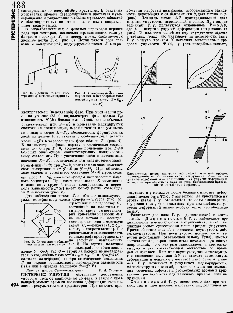 Лит. см. при ст. Сегпетоэлектприки, Б. А. Струков. ГИСТЕРЕЗИС УПРУГИЙ ≈ отставание деформации упругого тола от напряжения но фазе, в связи с чем в каждый момент времени величина деформации тела является результатом его предыстории. При цнклич. при-