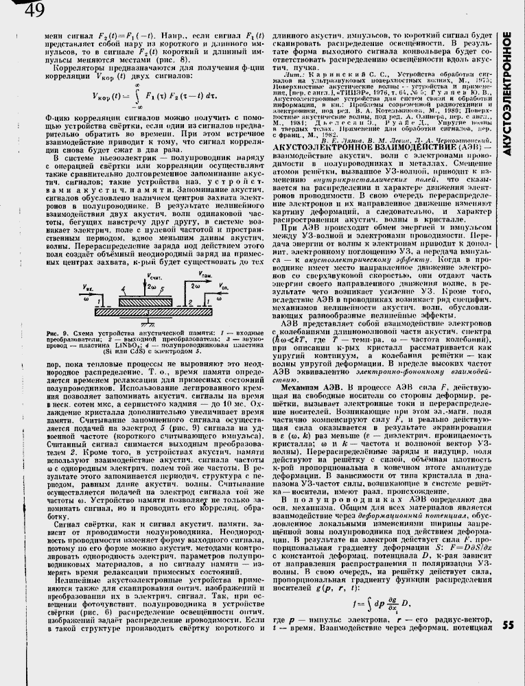 В системе пьезоэлектрик ≈ полупроводник наряду с операцией свертки или корреляции осуществляют также сравнительно долговременное запоминание акустич. сигналов; такие устройства паз. устройствами а к у с т и ч. и а м я т и. Запоминание акустич. сигналов обусловлено наличием центров захвата электронов в полупроводнике. В результате нелинейного взаимодействия двух акустич. волн одинаковой частоты, бегущих навстречу друг другу, в системе возникает электрич. поле с нулевой частотой и пространственным периодом, вдное меньшим длины акустич. волны. Перераспределение заряда под действием этого поля созда╦т объ╦мный неоднородный заряд на примесных центрах захвата, к-рык будет существовать до тех