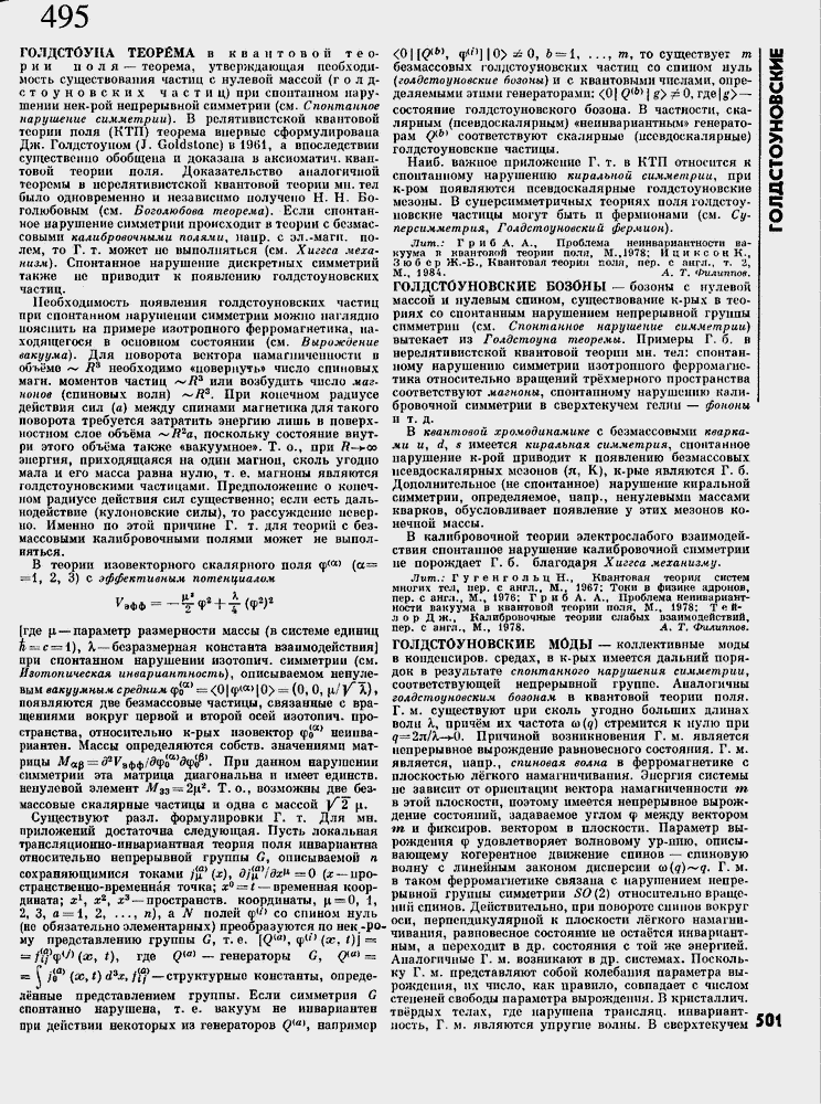 В квантовой хромоданамике С безмассовкгми кварками и, d, 5 имеется киралъная симметрия, спонтанное нарушение к-рой приводит к появлению безиассовых псевдоскалярных мезонов (л, К), к-рые являются Г. б. Дополнительное {не спонтанное) нарушение киральной симметрии, определяемое, напр., ненулевыми массами кварков, обусловливает появление у этих мезонов конечной массы.