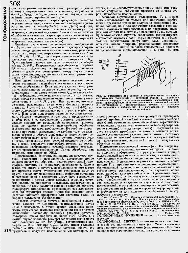 Лит.; Свет В. Д., Методы акустической голографии. Л., 1976; Ахмед M.t В а н К., Мидерслп А.т Голография и е╦ применение в акустоскопии, пер. с англ., <<ТИИЭР», И979. т, 67, с. 25; 3 у и к о в а Н. В., Свет В. Д., Об одном оптическом методе восстановления акустической голограммы точечного источника, расположенного в неоднородном волноводе, «Аиуст. ж,», 1981, т. 27, с. 513; Г р с г у ш П., Звуколидриие, пер- с англ., М., 1982- В. Д. Свет. ГОЛОМОРФНАЯ ФУНКЦИЯ ≈ см. Аналитическая функция.
