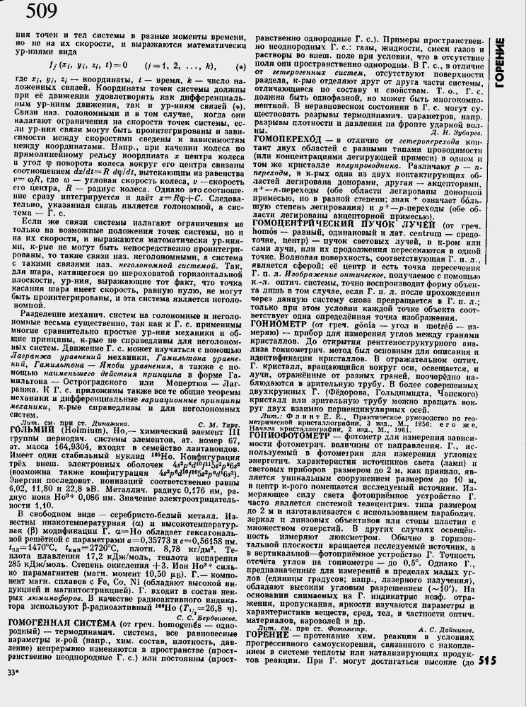 Лит. см- при ст. Динамика. С. М. Тарг. ГОЛЬМИЙ (Holmmm), Но,≈ химический элемент III группы периодич. системы элементов, ат, номер 67, ат. масса 164,9304, входит в семейство лантаноидов. Имеет один стабильный нуклид 1й5Но. Конфигурация тр╦х внеш. электронных оболочек 4s2/?6dl°/n5s2/>B6sa (возможна также конфигурация 4s2pedl0/105saj3tid16$2). Энергии последоват. ионизации соответственно равны 6,02, 11,80 и 22,8 эВ, Металлич. радиус 0,176 нм, радиус иона Но3+ 0,086 нм. Значение электроотрицатель-ногти 1,10.