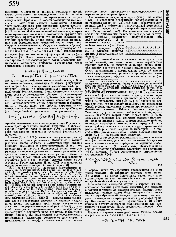 Лит.: II у д а л о и В. М,, С е м е н ч и л с ь и и С. Г., Инверсионные слои носителей зарнда в квантующем магнитном поле, («Поверхность», 1984. [в.] 4, с. 5; А и д о Т., Ф а у л с р А., Стерн. Ф,, Электронные свойства двумерных систем, пер. с англ., М,, 1985. В. С. Эделъман, ДВУМЕРНЫЕ РЕШЕТОЧНЫЕ МОДЕЛИ статистической физики ≈ матем. модели, в к-рых пространственная переменная принимает дискретные значения на плоскости. Нек-рые Д. р. м. допускают точное решение, что позволяет проверить осн. положения общей теории, определить пределы применимости приближ╦нных методов. Вблизи фазовых переходов 2-го рода Д, р. и. можно преобразовать в двумерные модели квантовой теории поля. Кроме того, Д. р. м. описывают реальные физ. системы: слоистые магнети-ки, пл╦нки жидкого гелия, с верх проводящие пл╦нки, монослои адсорбиров, атомов, волны зарядовой плотности, пл╦нки смектич. кристаллов и др. Первое точное решение Д, р. м. было найдено Л. Онсагером (L. Onsa-ger) в 1944 (см. Изинга модель). Далее рассматриваются лишь Д. р. м. на правильных реш╦тках.