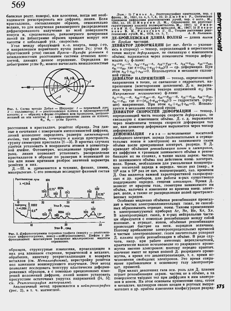 Угол между образующей к.-л. конуса, напр, i-ro, и направлением первичного пучка равен 2v/; угол О, {брэгговский угол) связан Брэгга≈Вулъфа условием с межплоскостпым расстоянием системы атомных плоскостей, дающих данное отражение. Определяя по дебаеграмме углы Ог-, можно вычислить межплоскостные
