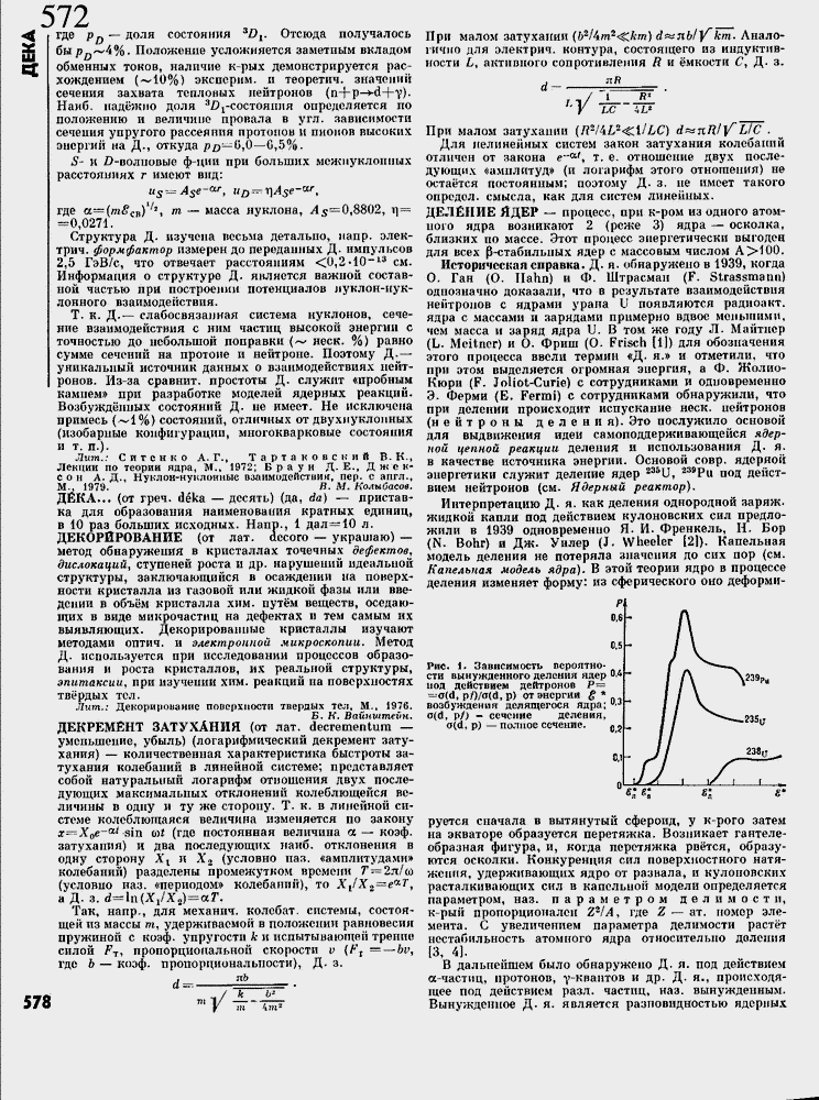 Историческая справка. Д. я- обнаружено в 1939, когда О. Ган (О. Ilahn) и Ф. Штрасман (F. Strassmarm) однозначно доказали, что в результате взаимодействия нейтронов с ядрами урана Ът появляются радиоакт. ядра с массами и зарядами примерно вдвое меньшими, чем масса и заряд ядра U. В том же году Л. Майтпср (L. Mcitncr) и О. Фриш (О. Frisch [1]) для обозначения этого процесса ввели термин «Д. я.» и отметили, что при этом выделяется огромная энергия, а Ф. Жолио-Кюри (F. Joliot-Gurie) с сотрудниками и одновременно Э. Ферми (Е. Fermi) с сотрудниками обнаружили, что при делении происходит испускание неск. нейтронов (нейтроны деления). Это послужило основой для выдвижения идеи самоподдерживающейся ядерной цепной реакции- деления и использования Д, я. в качестве источника энергии. Основой совр. ядерной энергетики служит деление ядер 235UT 239Pu под действием нейтронов (см. Ядерный реактор].