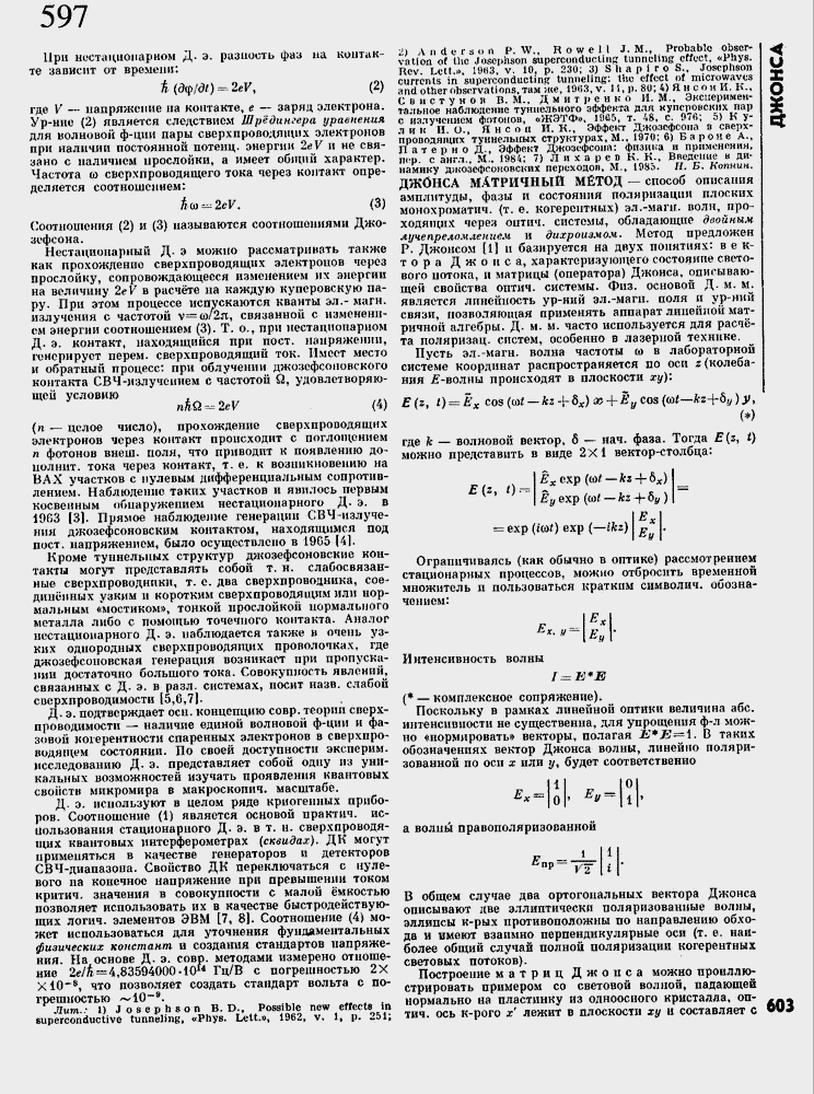 2) A n d e г г; о n P. W., R о w e 1 1 J. M., Probable observation of the Josephson superconducting tunneling effect, «]Jhys. Rev. Lett.», 19B3, v, 10, p. 230; 3) S h a p i г о S., Josephscm currents in superconducting tunneling: the effect of microwaves and other observations, там же, 19«3, v. II, p. 80; 4) flu сон И. К., Свистунов D. M., Д M и т р е н к о И. М., Экспериментальное наблюдение туннельного эффекта для ку перовских пар с излучением фотонов, «ЩЭТФ». 1Я65, т- 48, с. 07fi; 5) К у-л и н И. О., Я н с о н И. К., Эффект Джозсфсона в сверхпроводящих туннельных структурах, М., 1970; 6) Бароне А., Л а т е р н о Д., Эффект Джозсфсонй: физика и применения, пер. с англ., М., 1984; 7) Лихарев к. К., Введение н динамику дзкозефеоновсних переходов, М., 1985. Я. Б, Копним..