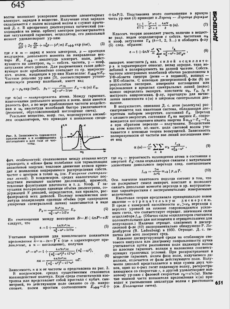 Квантовая теория предсказала принципиально новое явление ≈ отрицательную дисперсию. В среде с инверсией насел╦нности w.c^>w^ переходы с верхних уровней на нижние сопровождаются усилением света, что соответствует отрицат. значениям силы осциллятора /;J^, (Обычно силы осцилляторов считаются положительными для поглощения и отрицательными для испускания.) Наличие отрицат. слагаемых в дисперсионной ф-ле (10) экспериментально обнаружено Р. Л а-депбургом (R. Ladenburg) в 1930. Отрицат. Д. с. типична для всех лазерных сред.