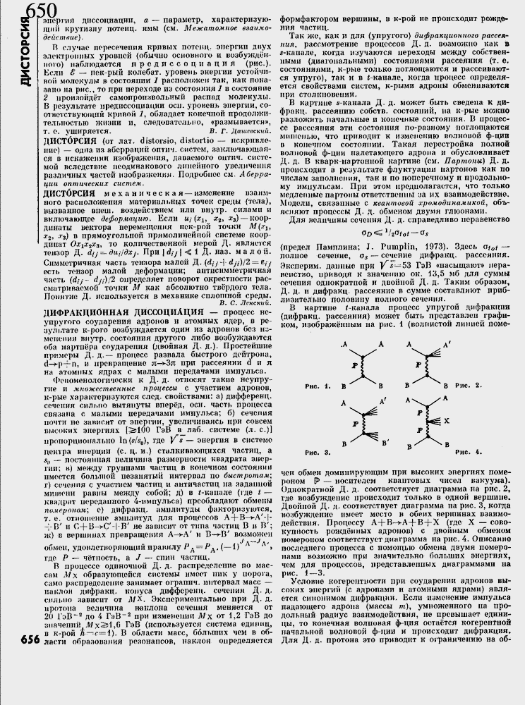 чей обмен доминирующим при высоких энергиях поме-роном [Р ≈ носителем квантовых чисел иакуума). Однократной Д. д. соответствует диаграмма на рис. 2, где возбуждение происходит только в одной вершине. Двойной Д. д, соответствует диаграмма на рис. 3, когда возбуждение имеет место н обеих вершинах взаимодействия. Процессу АН-В≈>-А-[-В-г-Х (где X ≈ совокупность рожд╦нных адронов) с двойным обменом померопом соответствует диаграмма па рис. 4, Описание последнего процесса с помощью обмена двумя померо-нами возможно при значительно больших энергиях, чем для процессов, представленных диаграммами на рис, 1≈3.