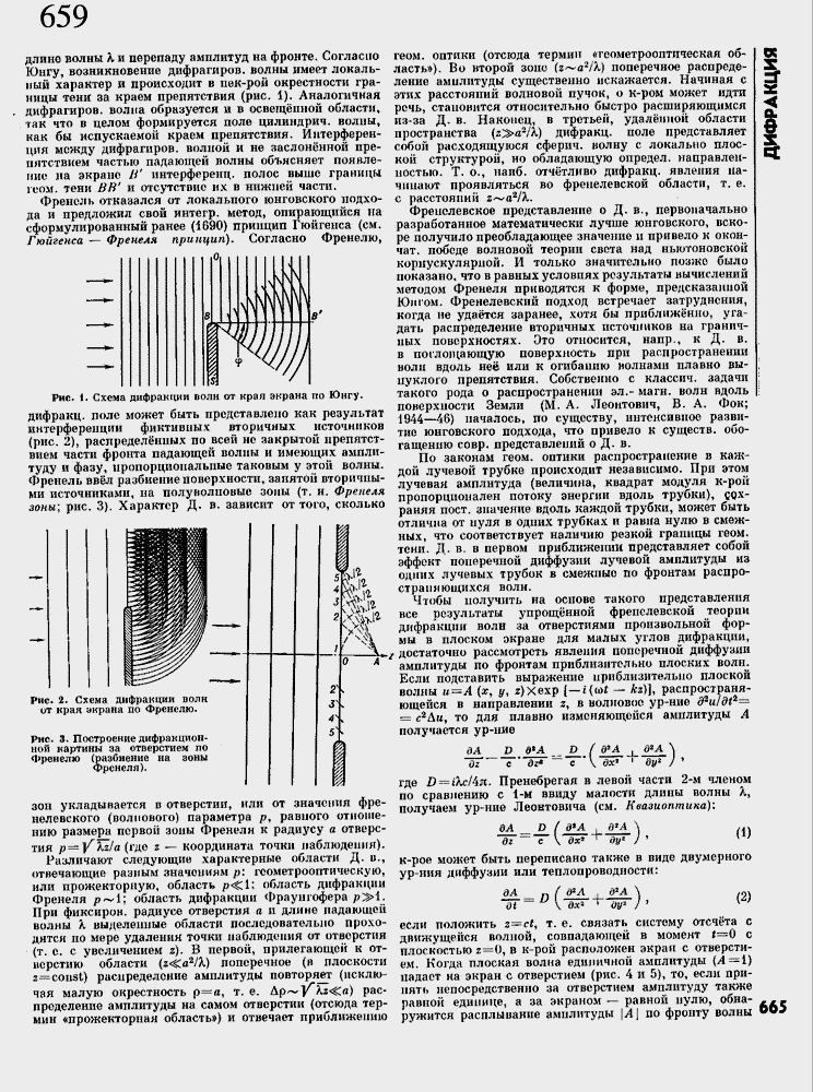 Чтобы получить на основе такого представления все результаты упрощ╦нной френелевской теории дифракции волн за отверстиями произвольной формы в плоском экране для малых углов дифракции, достаточно рассмотреть явления поперечной диффузии амплитуды по фронтам приблизительно плоских волн. Если подставить выражение приблизительно плоской волны ы=Л (#, у, z)Xexp [ ≈ i(idt ≈ ftz)], распространяющейся в направлении z, в волновое ур-ние с*2и/с^2= = с2Ды, то для плавно изменяющейся амплитуды А получается ур-ние