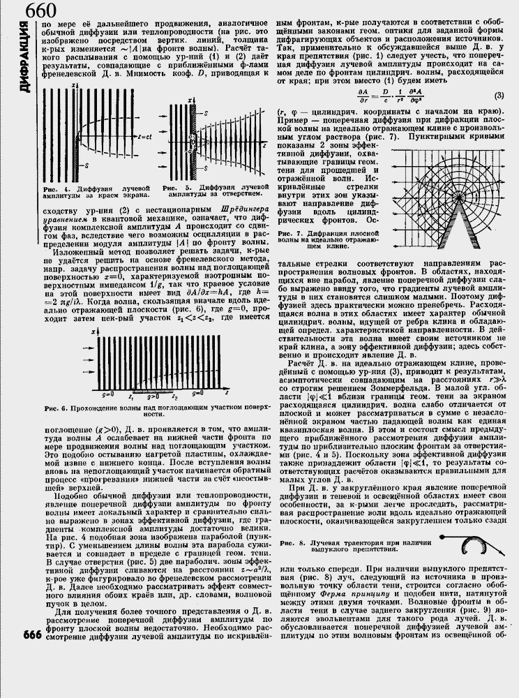 Расч╦т Д. в. на идеально отражающем клине, провед╦нный с помощью ур-ния (3), приводит к результатам, асимптотически совпадающим на расстояниях г^»Х со строгим решением Зоммерфельда. В малой угл. области [ф|<§с! вблизи границы геом. тени за экраном расходящаяся цилиндрич. волна слабо отличается от плоской и может рассматриваться в сумме с незаслон╦нной экраном частью падающей волны как единая квазиплоская волна. В этом и состоит смысл предыдущего приближ╦нного рассмотрения диффузии амплитуды по приблизительно плоским фронтам за отверстиями (рис. 4 и 5). Поскольку зона эффективной диффузии также принадлежит области ]<р|<£1, то результаты соответствующих расч╦тов оказываются правильными для малых углов Д. в.