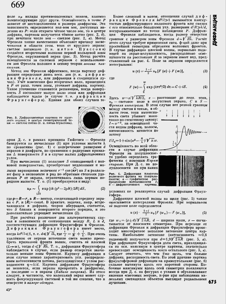 сравним с размером зоны Фрсполя d~~ ∙ \\ 7?л. Расчет этого случая требует применения спец. ф-цил даже при простейшей геометрии обрезания волновых фронтов. В случае дифракции плоской волны, нормально падающей на окрап-полуплоскость, распределение освещ╦нности на расстоянии R :на экраном имеет вид, представленный на рис. 4. Поле за экраном определяется интегралами: