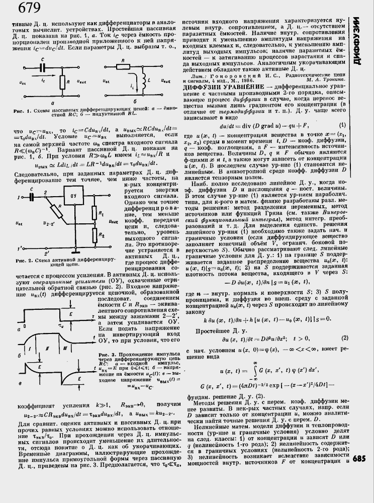 Наиб, полно исследовано линейное Д. у., когда коэф. диффузии D и поглощения q ≈ пост, величины. В этом случае ур-ние (1) является ур-иием параболич. типа, для к-рого в матем. физике разработаны разл. методы решения: метод разделения переменных, метод источников или функций Гряна (см. также Винеров-ский функциональный интеграл), метод интсгр. преобразований и т. д. Для выделения единств, решения линейного ур-ния (1) необходимо также задать нач. и граничные условия (если диффундирующее вещество заполняет конечный объ╦м У, огранич. боковой поверхностью S]. Обычно рассматривают след, линейные граничные условия для Д. у.: 1) на границе S поддерживается заданное распределение вещества u0(x, t): "(#! Ols^M^r 0; 2) на S поддерживается заданная плотность потока вещества, входящего в V через S: