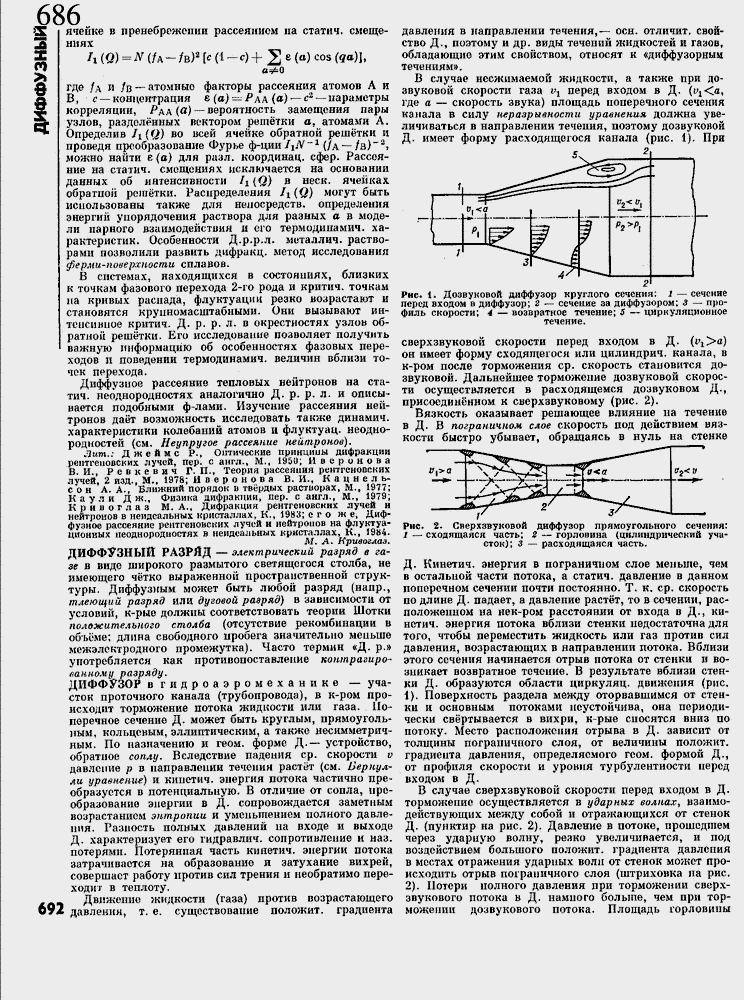 В случае несжимаемой жидкости, а также при дозвуковой скорости газа v^ перед входом в Д. (v^a, где а ≈ скорость звука) площадь поперечного сечения канала в силу неразрывности уравнения должна увеличиваться в направлении течения, поэтому дозвуковой Д. имеет форму расходящегося канала (рис. 1). При