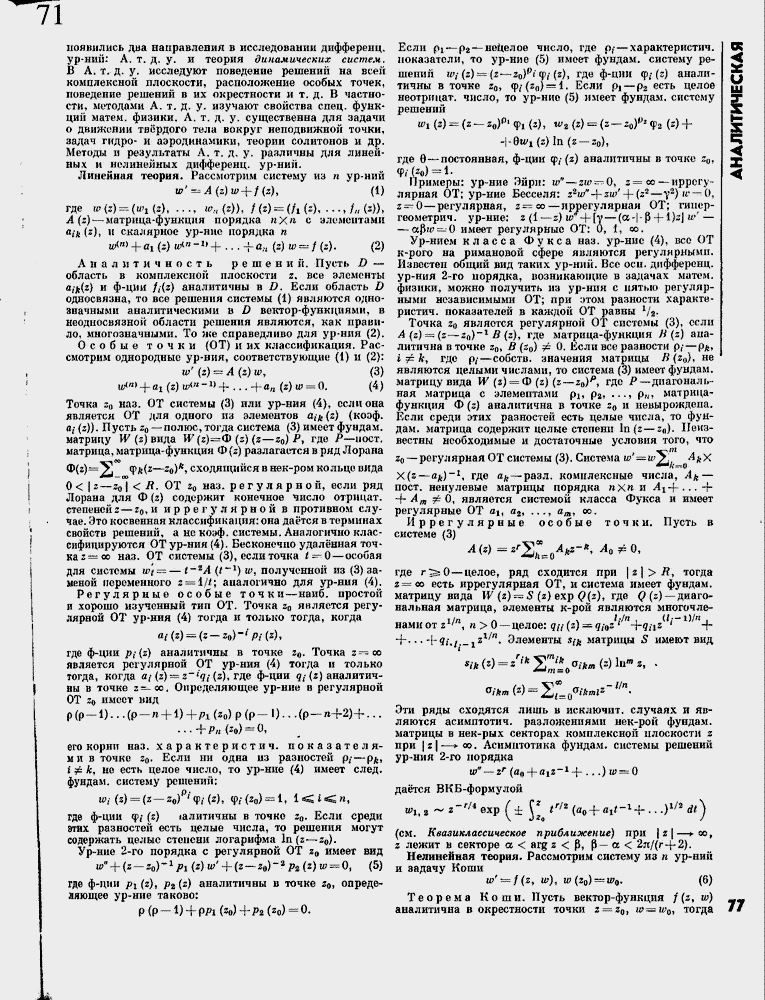для системы w't = ≈ t~zA (J"1) TV, полученной из (3) заменой переменного г = 1/*; аналогично для ур-ния (4). Регулярные особые точки ≈ наиб, простой и хорошо изученный тип ОТ. Точка zn является регулярной ОТ ур-ния (4) тогда и только тогда, когда