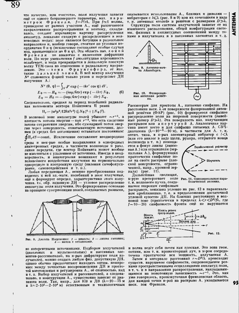 оказывается использований А., близких к диполям ≈ вибраторам с /^Х (рис. 8 и 9) или их сочетаниям в виде т. н. антенных «полей» и реш╦ток с размерами D~^>K. Структура поля системы излучателей зависит от их взаимного расположения, общей конфигурации системы, фазовых и амплитудных соотнотттений между токами в излучателях и в пассивных элементах и т. д.