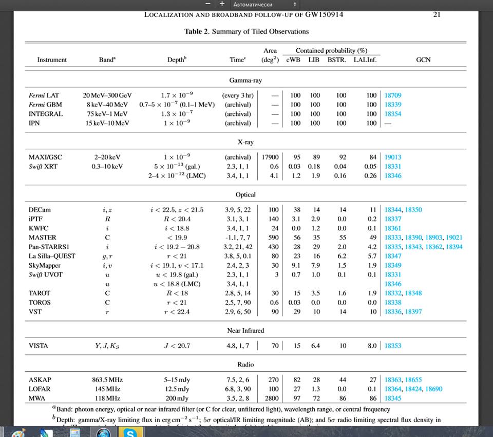 В таблице приводятся результаты обзоров в разных диапазонах электромагнитных волн первого в истории гравитационно-волнового события американского интерферометра LIGO. МАСТЕР обошел максимальное число квадратных градусов и опередил все остальные оптические телескопы мира покрыв более половины квадрата ошибок гравитационно-волнового импульса LIGO GW150914.