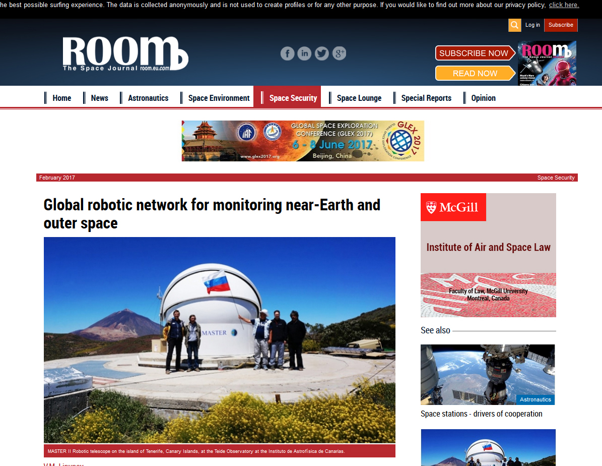 Читайте в новом европейском аэрокосмическом журнале Roomъ написал о нашем проекте Глобальная сеть космического мониторинга МАСТЕР