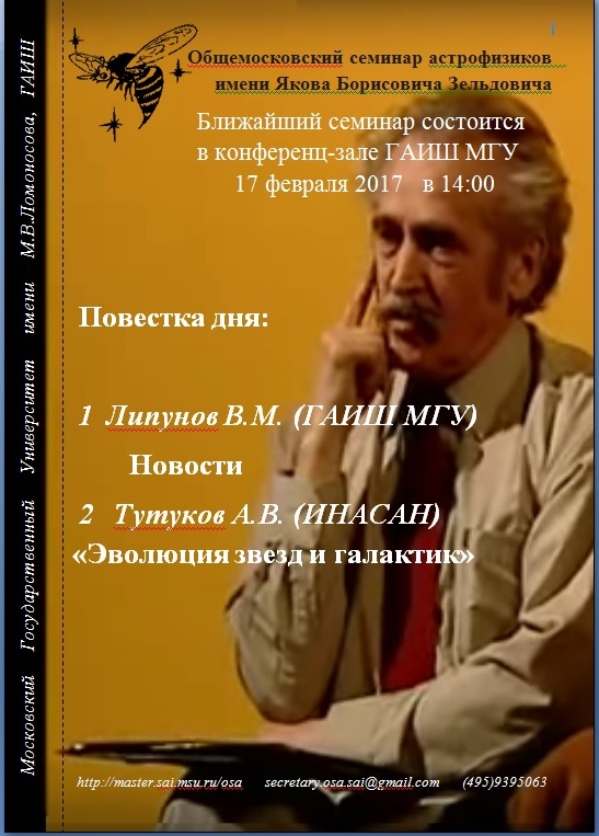 17 февраля 2017 в конференц-зале ГАИШ в 14:00 выступает лучший знакток эволюции звезд в мире Александр Васильевич Тутуков