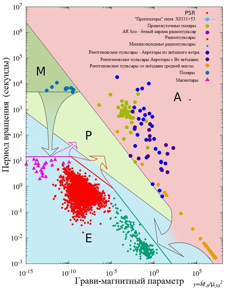 Но диаграмма не только объясняет, но подсказывает как обычные радиопульсары (красные точки) затухают переходя на стадию пропеллера, а некоторые из них - те что оказались в двойных системах, потом превращаются в рентгеновские пульсары (синие и феолетовые кружочки).