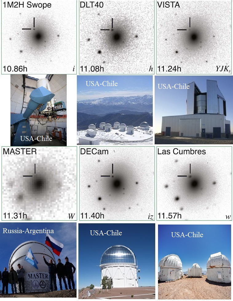 На левом фото: шесть изображений килоновой получененных до первой публикации с телескопа Swope. (Обратите внимание: на каждом кадре показано время истекшее после обнаружения гравитационных волн; цифры после запятой это не минуты, а доли часа - и следовательно от первого снимка до нашего МАСТЕРа прошло менее 30 минут. Кстати, свет шёл от места слияния нейтронных звёзд ~150 миллионов лет). Все эти телескопы признаны принципиальными соавторами краеугольной статьи по локализации гравитационных волн. Многие не понимают, что локализация в оптике, уменьшает неопределённость в координатах источника гравволн в миллиарды раз! Хочу подчеркнуть, что телескоп VISTA умудрился открыть килоновую в цвете! А DLT - не имел опорных кадров и Las Cumbris ничего никогда не открывал. Среди этих телескопов только МАСТЕР имеет историю массового открытия оптических вспышек (более 2000!).