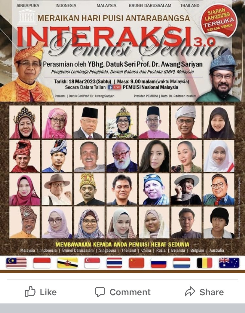 "На праздновании Международного дня поэзии в Куала-Лумпуре Interaksi, организованного национальной Писательской организацией «Поэт». Читаю стихотворение малайзийского классика Усмана Аванга «Родина» (Tanah Air). 18.3.2023"