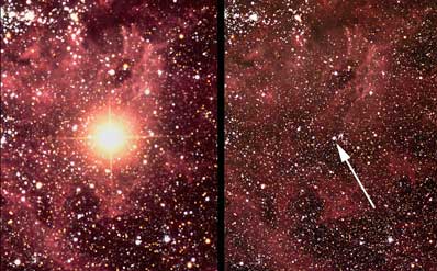 Фотографии взорвавшейся звезды, сверхновой 1987а, "до и после" взрыва. Photo: Anglo-Australian Observatory; Photograph by David Malin