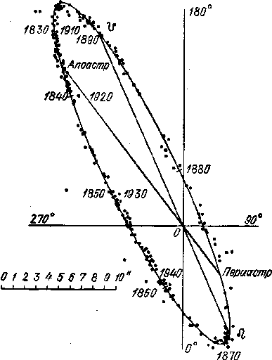 точками. (Наблюдения проводились с 1830 по 1940 гг. Шкала