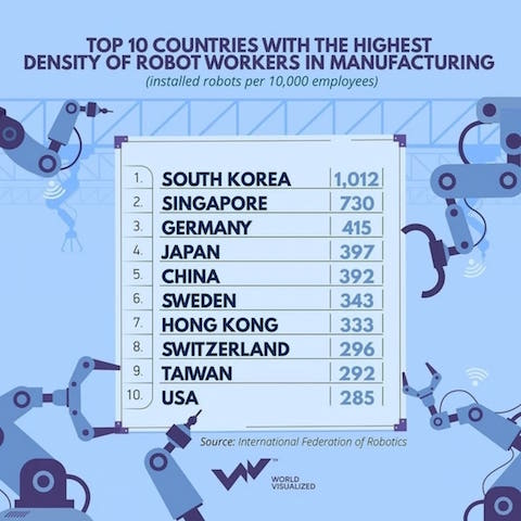 Топ-10 стран с самой высокой плотностью роботов на производстве