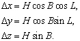 B, L ,H связывают понятия геодезической широты, долготы и высоты. Геодезическая широта В есть угол, под которым пересекается нормаль к поверхности эллипсоида с плоскостью экватора. Долгота L - двугранный угол между плоскостью нулевого меридиана и плоскостью меридиана, проходящего через заданную точку.Геодезические широта и долгота отличаются от соответствующих астрономических координат, связанных с отвесной линией, так как отвесная линия не совпадает с нормалью к эллипсоиду. Отклонение отвесной линии можно спроецировать на две плоскости: плоскость меридиана и плоскость первого вертикала. Нетрудно понять, что обе эти составляющие можно определить через разности между астрономическими и геодезическими координатами