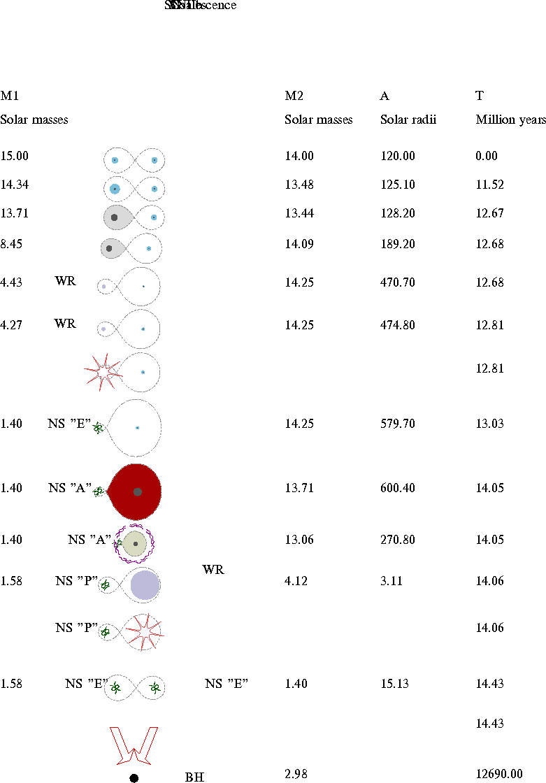 Эволюция двойной начинается с образования двух голубых звезд, внутри которых идет термоядерная рекция горения водорода в гелий. Затем первая, певоначально более массивная, звезда пережигает свой водород и увеличивает свой радиус, постепенно приближаясь к критической полости Роша, -- поверхности, разграничивающей области гравитационного влияния компонент двойной. Через 12.7 млн. лет она заполняет свою полость Роша и начинает перетекать на соседку. В результате происходит перемена ролей, -- первоначально более массивная звезда становится менее массивной. Обмен массой оканчивается в тот момент, когда центральное ядро первой звезды сжимается и отделяется от оболочки. При этом в ее ядре происходит возгорание гелия. Образуется так называемая астрономами звезда типа Вольфа-Райе (WR), которая через 130 тысяч лет пережигает весь гелий и взрывается как сверхновая звезда, оставляя сверхкомпактный остаток -- нейтронную звезду. Так как взрывается менее масивная звезда, -- система не разваливается, и эволюция продолжается. Нейтронная звезда проходит несколько стадий -- от состояния эжектирующей потоки релятивистких частиц быстро вращающейся звезды до медленно вращающейся аккрецирующей звезды. Но более важно, что ее соседка наконец пережигает свой водород и повторяет путь первой звезды, рождая в конце вторую нейтронную звезду: образуется система двух нейтронных звезд, одна из которых, более молодая, проявляет себя как радиупульсар. Такие системы реально сейчас наблюдаются в Галактике. Параметры двойной системы, состоящей из двух нейтронных звезд, полностью контролируются гравитационно-волновым излучением. Примерно через 12 млрд. лет гравитационные волны уносят весь орбитальный момент двойной, и звезды сталкиваются, выделяя гигантскую энергию, состоявляющую несколько десятков процентов энергии покоя звезд.