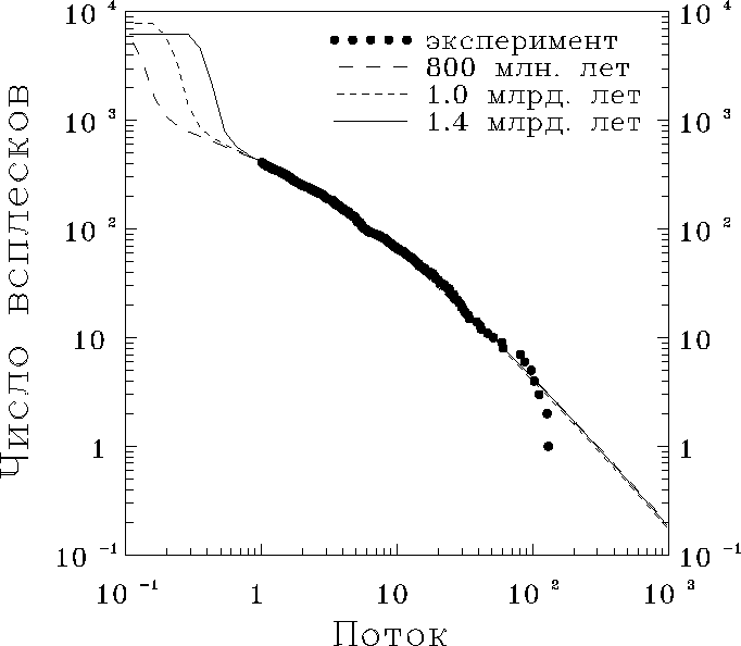 Последний эксперимент, поставленный на американской орбитальной гамма-обсерватории имени Артура Комптона (Compton Gamma Ray Observatory- - CGRO), позволил обнаружить более 2000 новых вслесков, и оказалось, что наклона -3/2 практически нигде нет (см. Рис. 2), а по небу источники распределены изотропно. Странная получается "галактика". Распределение по потокам показывает, что она дискообразная, а на небе никаких следов Млечного Пути нет!