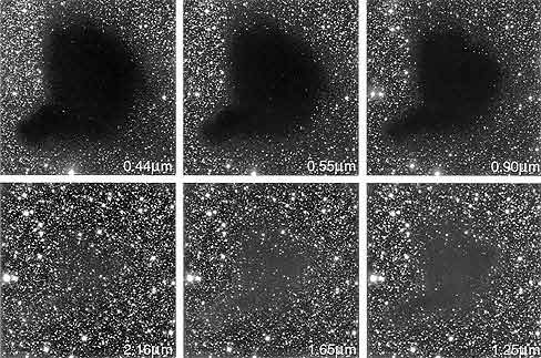 В 1999 г. на телескопах ЕЮО были установлены новые панорамные приемники инфракрасного излучения, дающие изображение по четкости не хуже оптического и при этом глубоко проникающие в недра пылевых облаков. Серия изображений глобулы B 68 демонстрирует, как при переходе к более длинноволновому излучению облако выглядит все прозрачнее. Два верхних левых снимка получены в оптических диапазонах: голубом (0,44 мкм) и желто-зеленом (0,55 мкм). А остальные четыре - в инфракрасных диапазонах от 0,9 до 2,16 мкм. Хорошо видно, как с ростом длины волны облако становится все прозрачнее: по краям, где плотность ниже, появляются изображения звезд. В основном это далекие светила, лежащие за облаком. Но не исключено, что некоторые из них находятся в недрах самого облака (это еще предстоит установить).