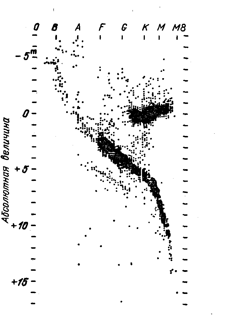 XX века. Для звезд скоплений Плеяды и Гиады он построил две одинаковые диаграммы ≈ зависимость видимой звездной величины от температур звезд (реально он пользовался не температурой, а прямо наблюдаемой степенью голубизны звезд).Через несколько лет, независимо от Герцшпрунга, американский астроном Генри Рессел начал строить аналогичные диаграммы для звезд, находящихся на известных расстояниях. Теперь эти диаграммы называются диаграммами Герцшпрунга ≈ Рессела. Среди сотен различных типов диаграмм, построенных астрономами за последние 100 лет, самой знаменательной оказалась диаграмма Герцшпрунга ≈ Рессела (рис. 26).
