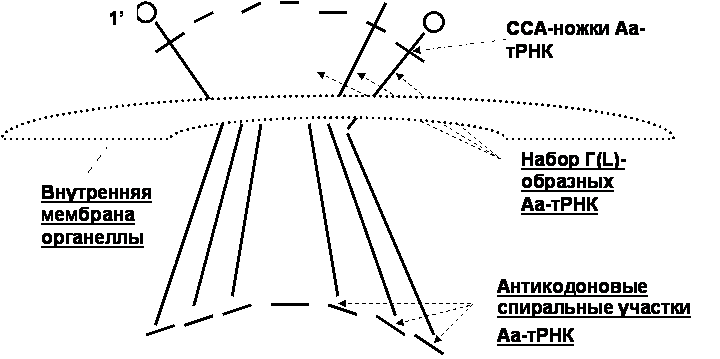 ═════════ Первым предложенным новым ("ХиЖ", ╧11, 1994г.) ═был механизм вариабельной обратной трансляции индивидуального эпитопа (вПОТ, вариабельной Поэпитопной Обратной Трансляции; почему поэпитопной - ниже), когда эпитоп - часть белка до 5-10 аминокислот - "застревал" на внутренней мембране органелл (Мт и Хп), и ориентировал вблизи себя набор соответствующих тРНК или ═аминоацил-тРНК, Аа-тРНК (Дейчман 1993; 1996). Именно внутренняя мембрана органелл трудно проницаема для транспорта любых компонент клетки, даже малых ионов, хотя, известно, что некоторые белки и нуклеиновые последовательности способны к трансмембранному транспорту (Зоров 1996). Такие наборы тРНК могут быть различны для клеток каждой ткани, т.к. синтезируют, преимущественно, специфические для себя белки (эпитопы). Оборот и уровень клеточных макроэргов (универсального АТФ и регулятора синтеза белка, ГТФ) также, известно, варьируют в разных тканях. Полуавтономные Мт и Хп═ воспроизводят макроэрги (регуляторы белкового, углеводного, жирового обменов) и содержат репликативный, белоксинтезирующий (+ редактирующий РНК?) мембрано-связанные аппараты.