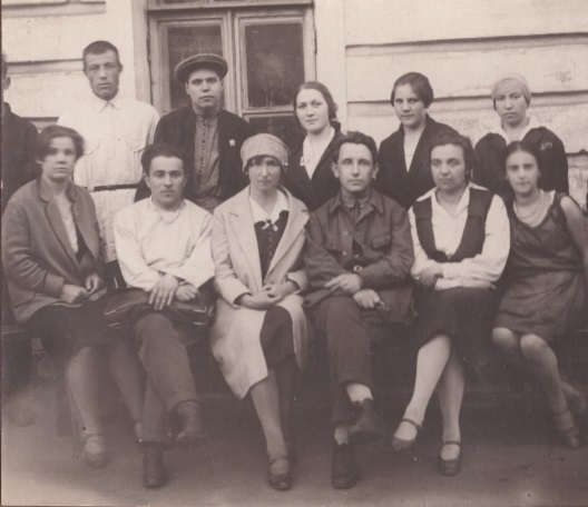 Потом мама полезла в шкаф и достала старые фотографии, одна из них была с завода «Точизмеритель». Вот сидит в первом ряду (третья слева) Екатерина Васильева, а моя мама, Дьякова (Яковлева) Антонина Николаевна стоит крайняя справа в верхнем ряду.
