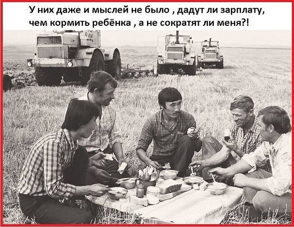 Фотография времен СССР – освоение целины, обед трактористов в поле.