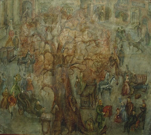 Акварель эту писал долго, иногда на кухне в коммунальной квартире, перевозил ее с собой, свернув бумагу трубочкой, работал над ней у деда в сельском доме в Раменском. Один фрагмент, слева вверху, с изображением дамы в кринолине и господина в котелке мне особенно удался. Его написал, можно сказать с посещением вдохновения. Когда работа была закончена, я показал ее Рогинскому.