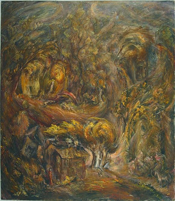 С этой работой у меня в памяти связана история ее создания. Писал я ее весной, в апреле-мае 1974 года, во время работы ставил одну и ту же пластинку Боба Дилана, которую мне подарила тогдашняя моя подружка француженка Мари (люблю работать под музыку). Сергей Патрушев дружил с Клер, Александр Кузьмин с Натали. Откуда приходили и куда уходили эти мадмуазель, для меня было загадкой. Мари постоянно динамила меня. Я начал писать на листе оргалита казеиново-масляной темперой, импровизируя и размазывая цветовые пятна без всякой цели. Ближе к центру листа возникло голубое пятно, слева и справа - оранжевое, красное, желтое, фиолетовое. Смеркалось. Цветовые пятна стали еле различимы в полумраке, но внизу листа отчетливо возникла женская фигурка в белом платье, стоящая под осенними деревьями, за стволом одного из них угадывалась мужская фигурка в шляпе. Когда я включил свет, эти образы исчезли, были только яркие пятна цвета. Выключил свет - они стоят. И вот как-то изловчившись (кажется, даже свечку на шляпу прикреплял) эти две фигурки под осенними деревьями я всё-таки наметил. Эта деталь картины была другого колорита, вообще это был фрагмент другой композиции, написанный на фоне живописи резко отличавшейся от него по цвету и стилю. Так постепенно работая над этой вещью, фрагмент у меня с двумя фигурками расширялся в пространстве, и возникла другая картина. Назвал я ее "Осенний вихрь". Сейчас, анализируя свой творческий опыт, считаю, что смысл занятия живописью, заключается в процессе ее создания. Важен не результат, а процесс сотворения картины. Эта мысль пришла ко мне намного позже, а тогда писал особенно не задумываясь, интуитивно постигая смысл живописи. Конечно, это касается только меня. С картиной "Осенний вихрь" связан еще один эпизод из моей арбатской жизни. Я писал эту вещь, в этот процесс громко ввинчивался космический звук блюза в исполнении Боба Дилана; периодически, чтобы заменить воду в банке, мотался по длинному коммунальному коридору, окурки "Беломора" швырял за ванну. Через какое-то время, я услышал беготню в коридоре, дверь приоткрылась и Саша Кузьмин, в это время живший у нас, крикнул: "Пожар!". Выскочив за дверь, я увидел в конце коридора пылающую огнем ванную комнату. Каким-то образом Сережа Патрушев, Саша Кузьмин и я смогли потушить это возгорание до приезда пожарных, мы быстро свалили из квартиры.