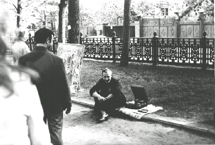 Сопровождал меня и был фотографом мой друг Серёжа Миллер. Машин почти не было, погода была солнечная. По ходу движения Сергей Миллер фотографировал мой московский заезд. Прохожие воспринимали это зрелище, как нечто из цирковой бродячей жизни, некоторые улыбались. Переехав Крымский мост, затем, проехав по Метростроевской улице, я вкатил арбу с картинами на Гоголевский бульвар. На бульваре мы с Сергеем быстро натянули веревку между деревьями на уровне человеческого роста, повесили на нее холсты, листы оргалита просто прислонили к веревке, патефон поставили на траву газона и подкрутили: Утесов с пластинки запел "Дорогие мои москвичи".