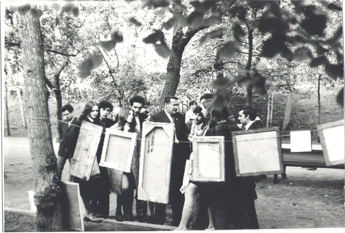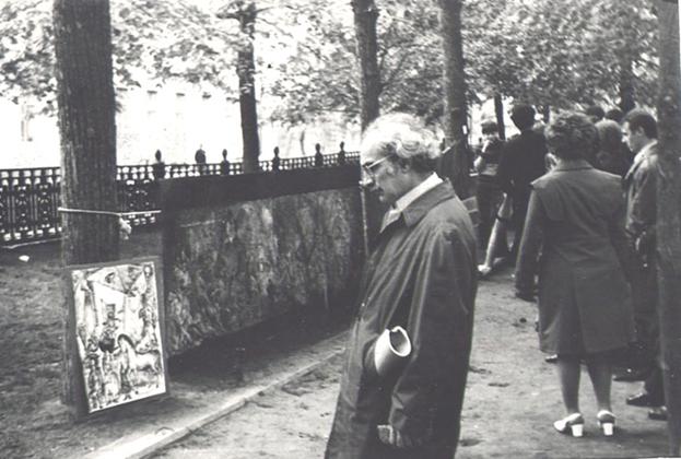 Композиция "В ночном саду распустились розы" вызвала вопросы, так как был коллаж из игральных карт. Живо проходило обсуждение картины "Осенний вихрь". Два подвыпивших мужика, недоуменно уставившись на работу с надписью "Вино", хотели, было, опрокинуть ее, но обошлось. По окончании моей уличной выставки, погрузив в телегу картины, я с друзьями повез ее по Гоголевскому бульвару в сторону Арбатской площади. В каморке дворника, новом жилье Сергея Патрушева, в Нижнем Кисловском переулке с компанией друзей я устроил скромный выпивон.