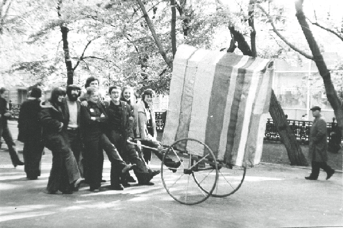 Яркие воспоминания в памяти оставили наши похождения с Сергеем Миллером по арбатским задворкам и выселенным, обреченным на слом домам. Летом 1974 года во дворе на улице Фрунзе я увидел тележку с большими металлическими колесами и укатил ее к себе в дворницкую. Сварщик в театре Оперетты сварил по моему чертежу каркас из толстой проволоки, его я обтянул плотной тканью, покрасил её полосами разного цвета, а колеса красной краской. Получилась телега-арба, с ярким цветным азиатским тентом и громыхающими при езде по асфальту колесами. В эту телегу-арбу я погрузил свои холсты, живопись темперой на оргалите, красный патефон, пластинки, веревку. Утром 25 августа, предварительно пригласив своих друзей и знакомых на предстоящую выставку, я покатил эту громыхавшую колесницу по Комсомольскому проспекту в сторону центра Москвы.