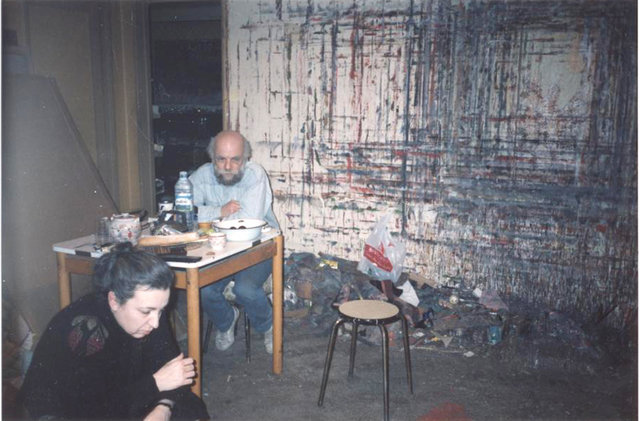 Выписавшись из больницы, я попал в полосу запоя. Депрессия сменялась эйфорией и наоборот. Как-то утром, в выходной день, принял душ, надел белую рубашку и поехал на Ваганьковское кладбище навестить родственников, прибрать могилу. При выходе из метро, около эскалатора на станции "1905 года", в толчее народа, видимо от духоты мне стало дурно. Справившись с приступом тошноты, обрёл другую напасть - лица в толпе стали приобретать зеленовато-фиолетоватый оттенок, шагающие мимо не люди, а упыри и вурдалаки - касались меня скользкими плечами. Обитатели кладбища возвращались к себе в подземные квартиры. Дома появились другие симптомы болезни : при разговоре по телефону, отчётливо стал слышать в ушах морзянку - звучали цифры. Как учили в армейской саратовской учебке, для лучшего запоминания, в напеве, цифра один - это "куда ты пошла?", цифра два - "я на гору пошла", цифра три - " иди ты на хуй"... Короче, у меня ехала крыша. Просто я не обратил внимания, что электросчётчик, под которым я сидел в коридоре издавал слабое попискивание, а в моём, разогретом алкоголем, мозгу оно превращалось в азбуку Морзе. Приехала жена. Я, смеясь, рассказал ей о своих галлюцинациях. Она отнеслась к этому серьёзно - позвонила знакомому врачу, договорилась о встрече. Заехал Миша Рогинский, трогательно остался ночевать. Наутро, долбанув на кухне шампанского, стал писать его портрет. Писал на полу, маслом на холсте с использованием сухого конского навоза и зерна. В это время я работал над cерией картин к выставке "Путь естества". Рогинский разглядел, что я подшофе, удивился моей оперативности: "Когда же ты успел?". Через пару дней я сидел в кабинете врача в неврологическом отделении городской больницы .67 на Хорошёвском шоссе. В общем, время тогда было перестроечное, за триста долларов меня положили в отдельную палату. Рядом была палата, куда привозили алкоголиков с белой горячкой. Я попросил жену, чтобы она захватила карандаши и бумагу, стал заходить к соседям и рисовать больных.