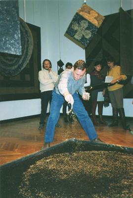 Объекты: "Песочные часы", "Куб Гераклита", "Лечение Земли", "Жизнь - ьтремС", "Смерть - ьнзиЖ", "Окно", "Колесо-спираль" и др., создавались один за другим. Когда проект выставки был готов, я показал его искусствоведу Сергею Кускову, договорились о статье. Открытие выставки "Путь естества" состоялось 24 октября 1995 года. На вернисаже я засеял белым зерном травы темную землю, высыпанную в виде круга, в центре зала, и поливал ее ежедневно из лейки. Трава взошла. Ярко-зеленый круг травы был цветовой доминантой в умбристо-коричневом колорите зала.