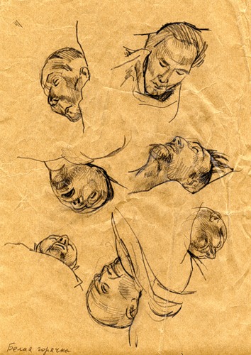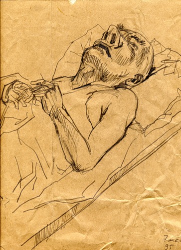 Здоровье у этих ребят было совсем подорвано "нарзаном" - некоторые голыми были привязаны простынями за руки и за ноги к кроватям, бредили, головы были запрокинуты. Другие в подавленном состоянии духа сидели на кроватях. Их рассказы, жизненные истории алкоголиков, запомнились своей комической нелепостью, абсурдностью. Лечащий врач скептически, с недовольством отнёсся к тому, что я стал рисовать и беседовать с больными: "Зачем это, какие цели?". Я пообещал, что эти рисунки в ближайшее время никто не увидит. Это было в начале мая 1995 года. С грустью наблюдал я, как за окном появлялись бледные весенние зелёные листья, а пациенты соседней палаты, один за другим, немного помучившись, отправлялись в мир иной, их тела в больничный морг...