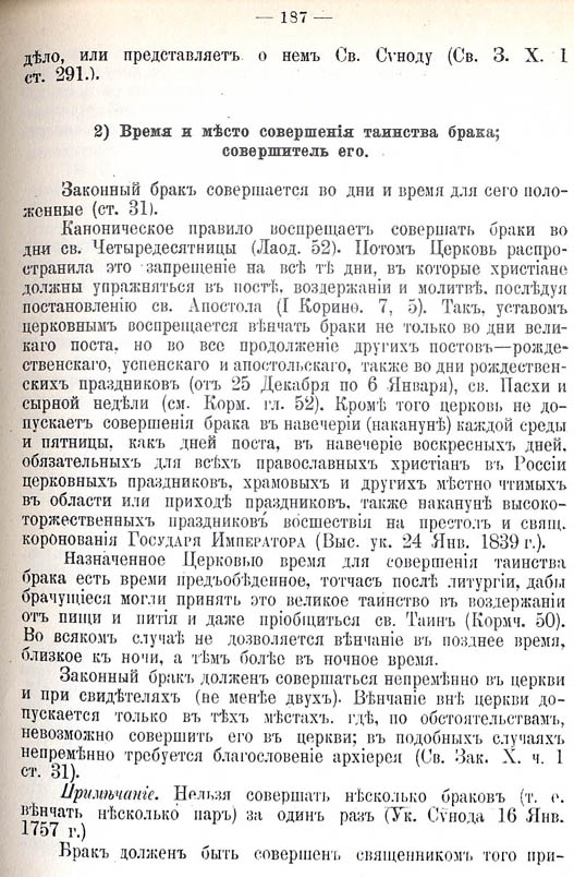 Каноническое правило запрещает совершать браки в дни св. Четыредесятницы (Лаод. 52). Потом Церковь распространила это запрещение на все те дни, в которые христиане должны пребывать в посте, воздержании и молитве, следуя постановлению св. Апостола (1 Коринф. 7:5). Так, церковным уставом запрещается венчать браки не только в дни великого поста, но и в течение других постов ≈ рождественского, успенского и апостольского, а также в дни рождественских праздников (с 25 Декабря, по 6 Января), св. Пасхи и сырной недели (см. Корм. гл. 52). Кроме того, Церковь не допускает совершения брака в вечернее время (накануне) каждой среды и пятницы, как дней поста и в вечернее время (накануне) воскресных и праздничных дней. (Выс. ук. 24 Янв. 1839 г.)■ (подчеркнуто мной).