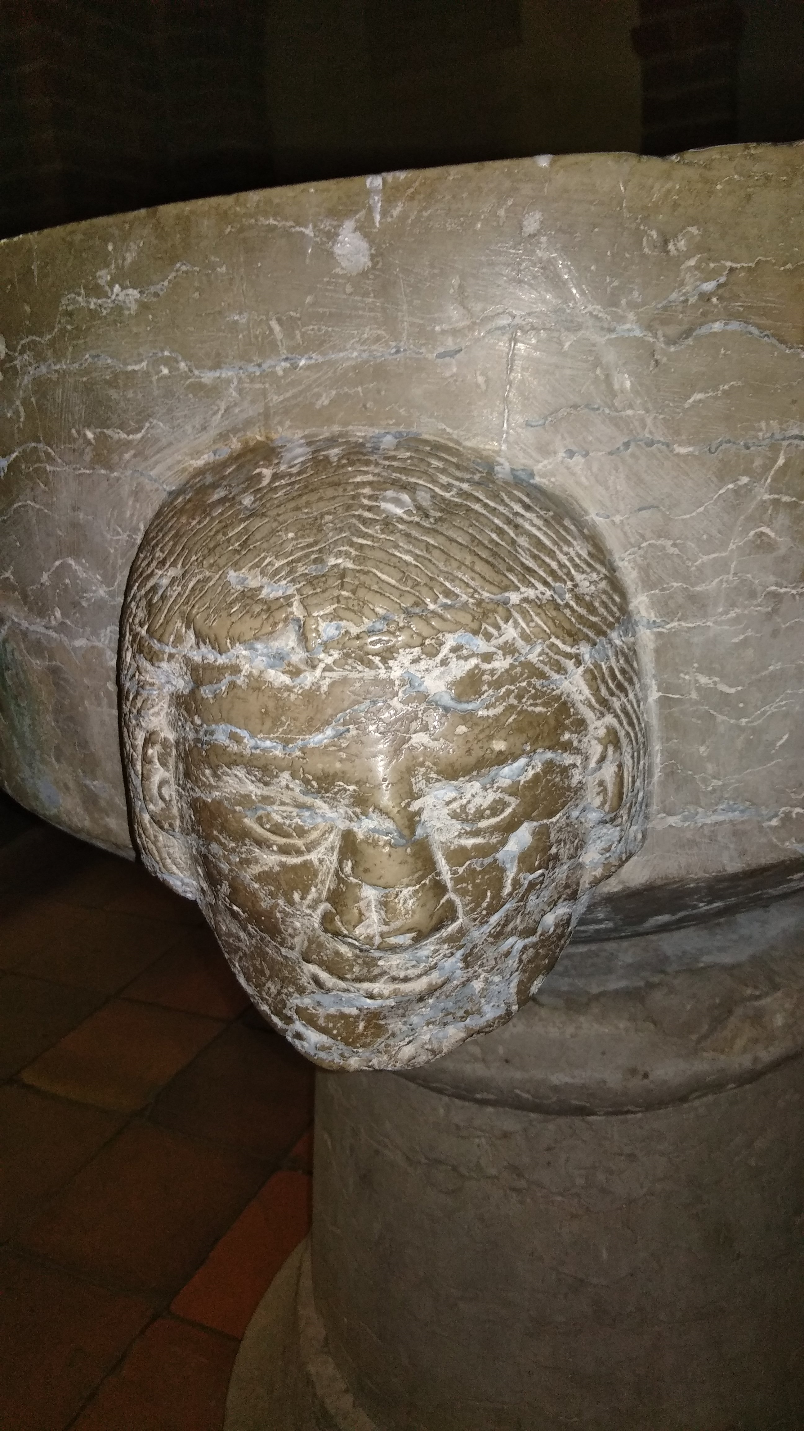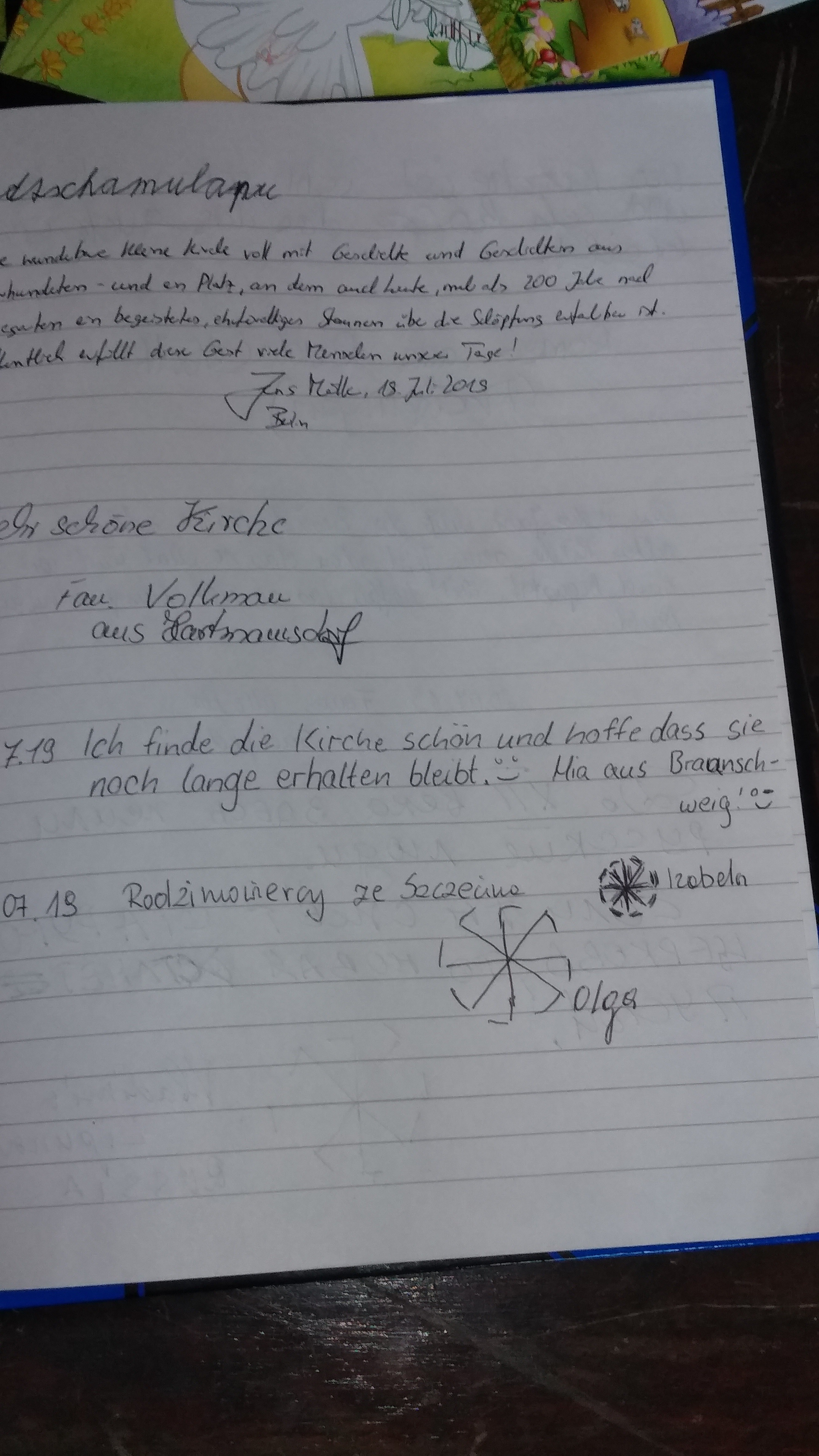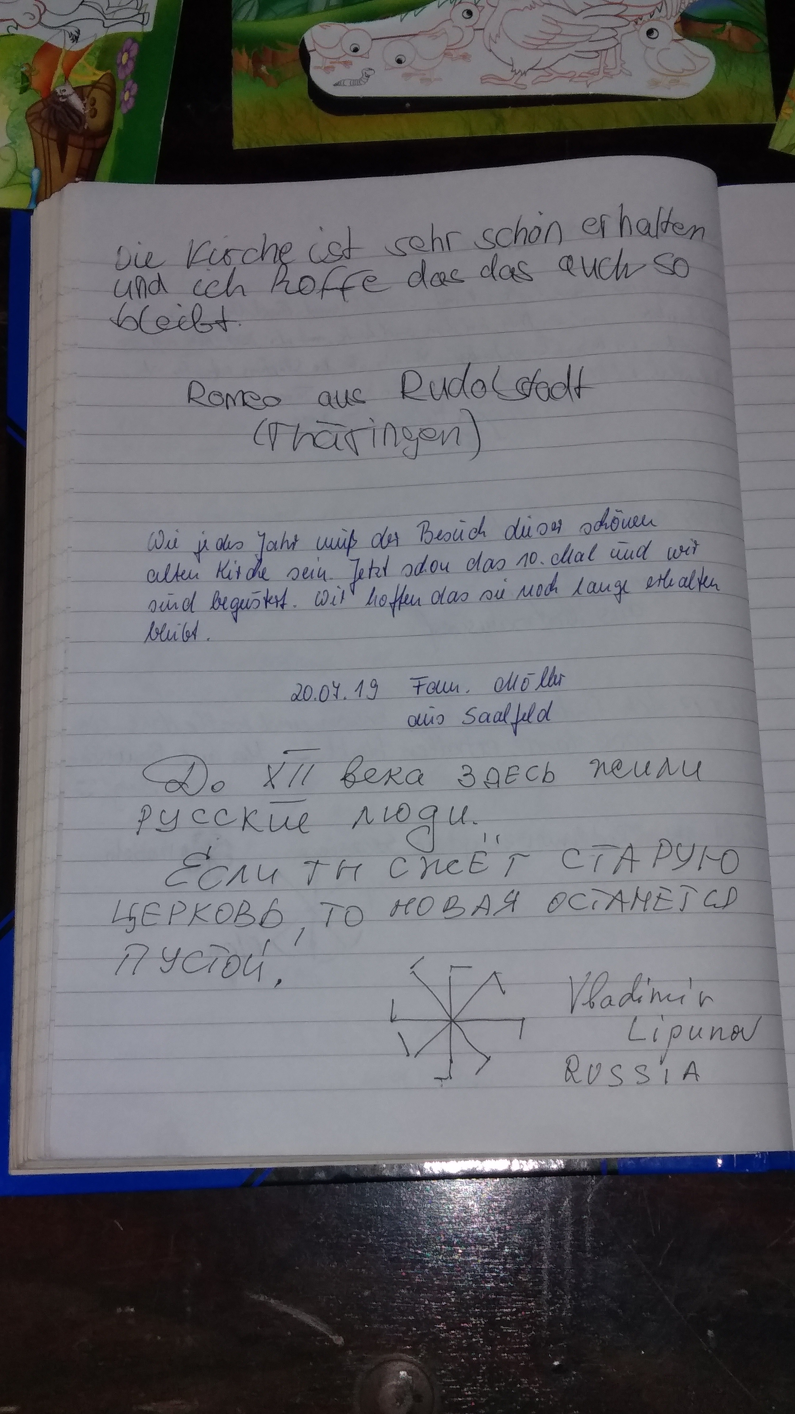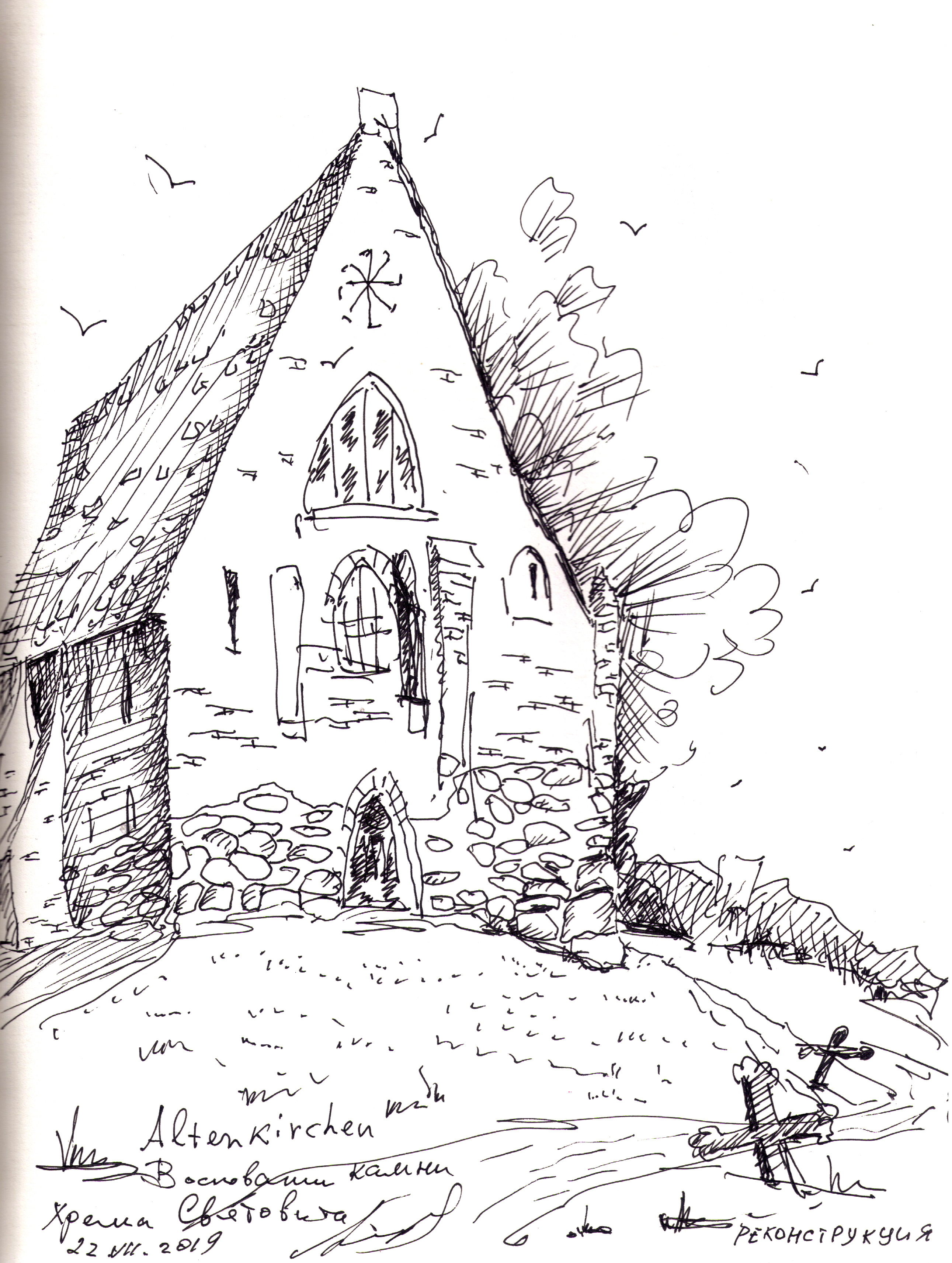 Лютеранская церковь на Рюгене (Altenkirchen). В приделе положен барельеф - бога Световита из разрушенного в Арконе храма световита. Положен на бок. - Полевые цветочки на нем принесены славянами-родноверами из - Польши. Замечательная чаша с многоликим Световидом использовалась последние - 900 лет для крещения младенцев. Здесь заложена идея многоединства Бога. В - книге отзывов я оставил свою запись, а на обороте обнаружил польскую.