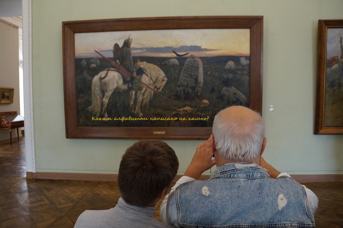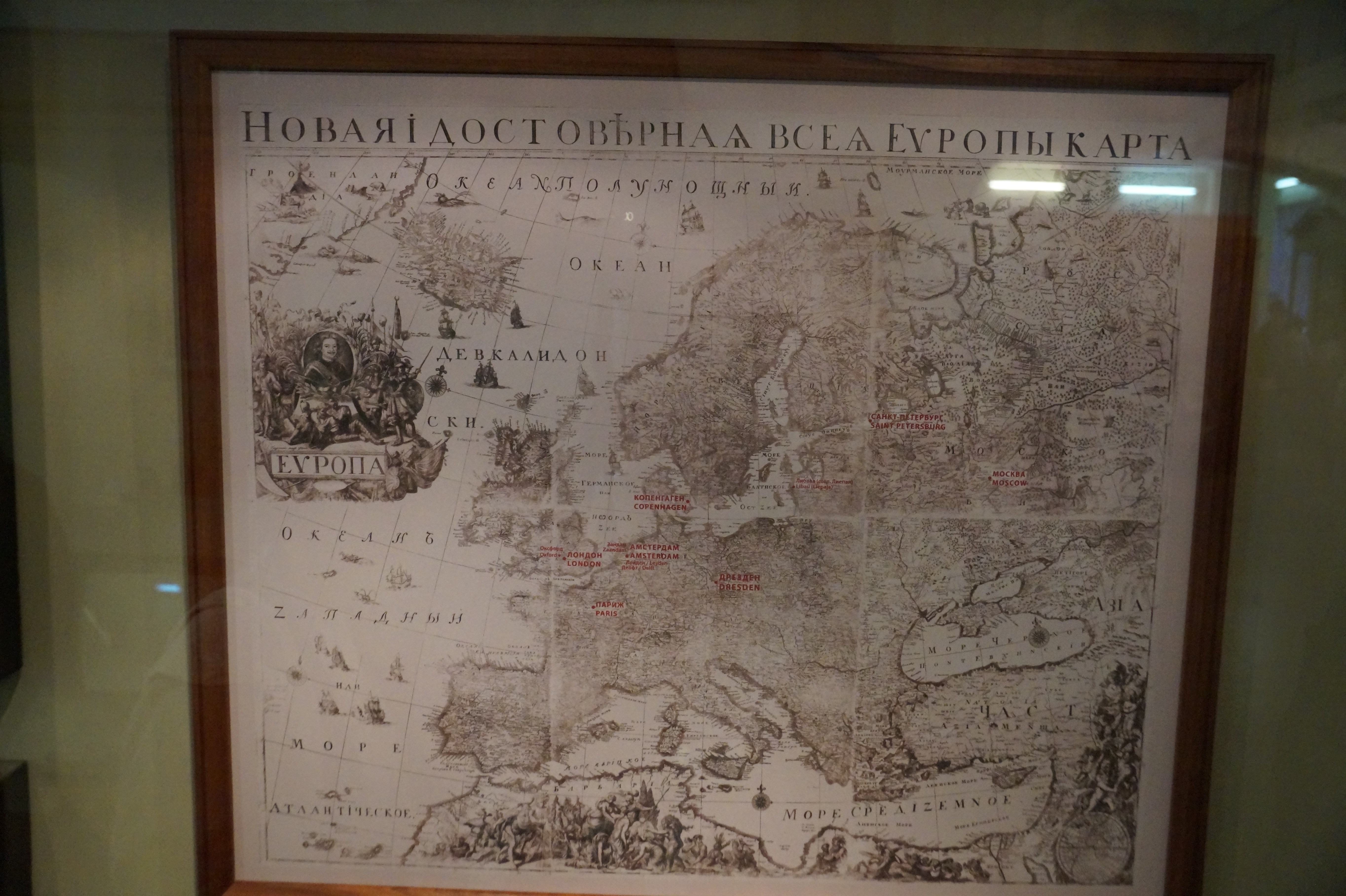 Следующий пункт нашей экспедиции Санкт-Птербург. Главнаые цели: "Русский музей" (давно хотел узнать на какой такой кириллице читает "Витязь на распутье" или сказка эта не из дохристианского времени?) и, второй - это Кунсткамера, кабинет Михайло Васильевича Ломоносова и чуднАя карта в его кабинете. В кабинет не пускали и пришлось по-шпионски, перегнувшись за канат, в три погибели снять карту, как бы из-за угла. Карта интресна тем, что собственно вся Россия там на Севере аж до Белого моря, а ниже Вологды - Московия. Составлял её по наущению Петра, человек копируя с западной карты, плохо писавший по-русски. Хочу подчеркнуть, два "сс" в слове "русский" появилось при романовых - немцах (гаплогруппа R1b).